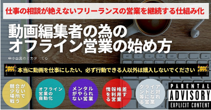 ⇒「動画編集者・映像クリエイターの為のオフライン営業の始め方」をゲット♪